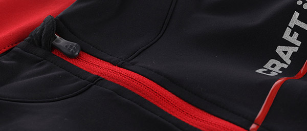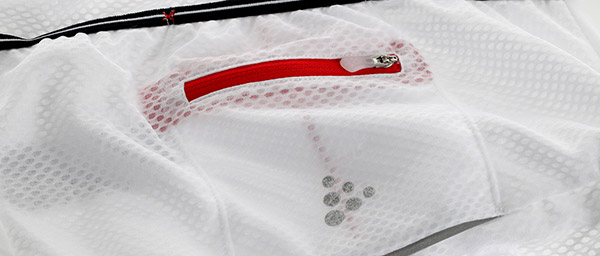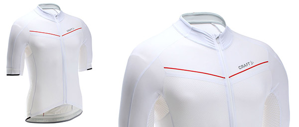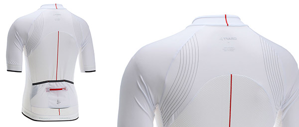 But material science alone doesn't make a great garment. The angles and contours of the body in the cycling position dictate the panel shapes and the direction weaves are applied. Even four-way stretch material must be aligned to maximize its capabilities. Examine the back and panels, as well as the transitions between them. Identify the shape and form of the raglan sleeve design. Craft uses its Moving Wing Technology™ to build a form-fitting zone that stretches, moves, and supports with the requirements of a cyclist locked into the drops, but also feels natural and unrestrictive when hard, out of the saddle efforts are required. Overall, you will see the seams and lines are effectively streamlined to minimize drag. The sleeves are longer than a traditonal race jersey, for cleaner air flow and bicep/tricep support. These are the details only a cyclist could provide. Others, like the placement and format of the back hem and arm sleeve grippers, also come from pro rider input. The mid to lower back is highly breatheable, and the three pocket design is reinforced for structure and purpose. A fouth, zippered pocket is located outside the center slot, and access is provided for a headphone or race radio cord. Reflective tabs and logos provide visibility. A truly great race level jersey, the Craft Tech Aero is impressively engineered, and passionately worn. Best viewed at high speeds.