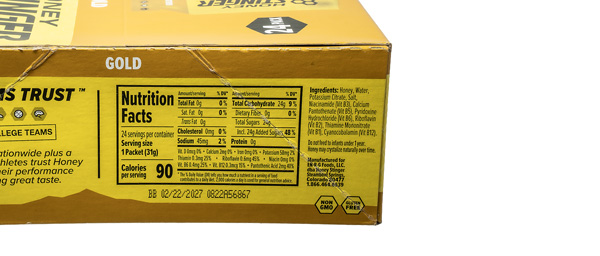 Beyond the honey base, the formula includes a full B-vitamin complex (B1, B2, B3, B5, B6, and B12) plus electrolytes from potassium citrate and salt. The B vitamins support energy metabolism during sustained efforts, while the electrolytes help offset what you're losing through sweat. At 50mg sodium and 85mg potassium per packet, the electrolyte content is modest but provides a baseline you can supplement with drink mix or tabs depending on conditions and sweat rate.