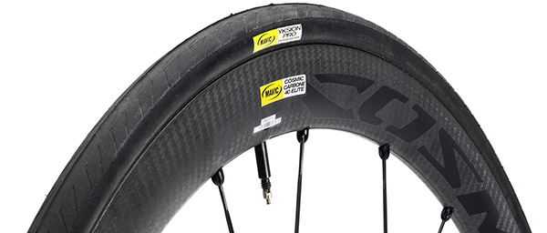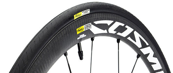 Mavic includes their Yksion Pro Powerlink and Griplink 700x23 clincher tires. The single compound rubber of the rear Powerlink features a wide, harder durometer center for limited rolling resistance, and directional grip for fast acceleration. The outer shoulders use a softer application of the same rubber, which ensures terrific grip when leaning over. The tread design is directional, with angled channels that help with grip and sipe water away from the center section. The front Griplink is softer, for more overall grip when cornering, with a smoother rider quality. Both share the same 127tpi nylon casing which augments the rubber and has a true rounded shape. In between the rubber and the casing a polymide breaker (wider for the Powerlink, narrower for the Griplink) is supple enough to match the casing and offers puncture protection.